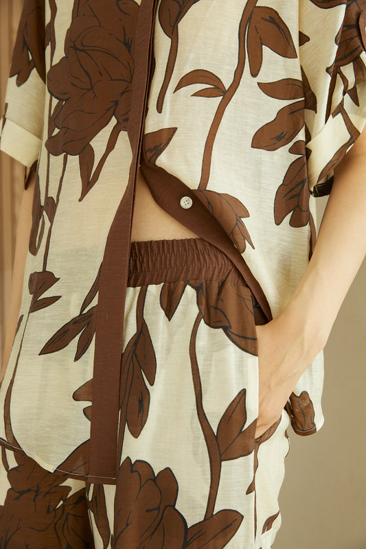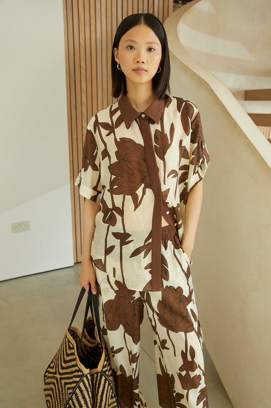 Jovonna LondonDion Brown Linen Blend Floral Print Relaxed Shirt
