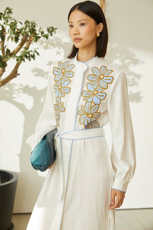 Mariska White Embroidered Cotton-Linen Midi Shirt Dress With Slip