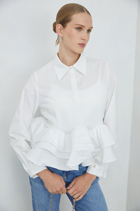 Jovonna LondonCarenza White Collared Peplum Shirt with Ruffle Hem