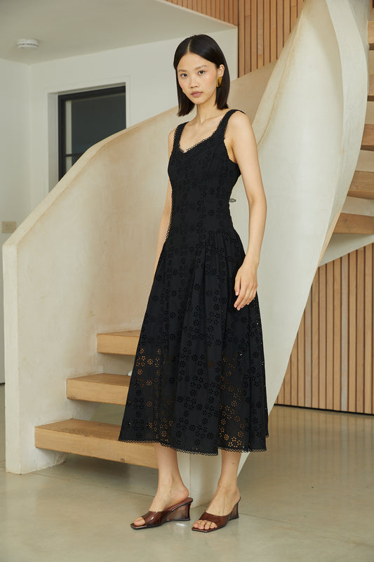 Nerida Black Cotton Eyelet Lace Sleeveless Fit & Flare Midi Dress