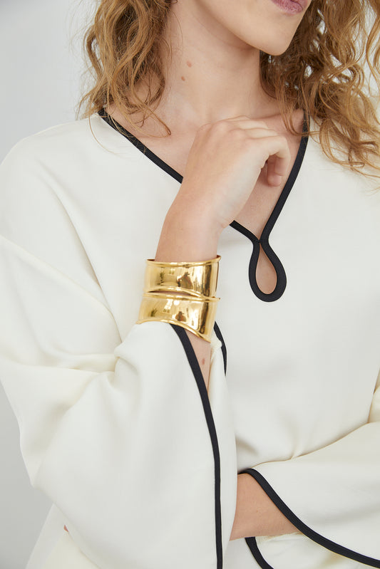 Ysabella Cream Long Sleeve Contrast Trim Midi Dress with Keyhole Neckline