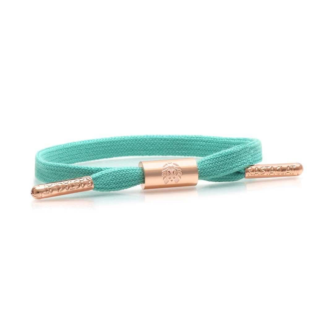 - Turquoise Women's Single Lace Bracelet Featuring Electroplated Peach Gold Hardware And Laser Etched Emblems.