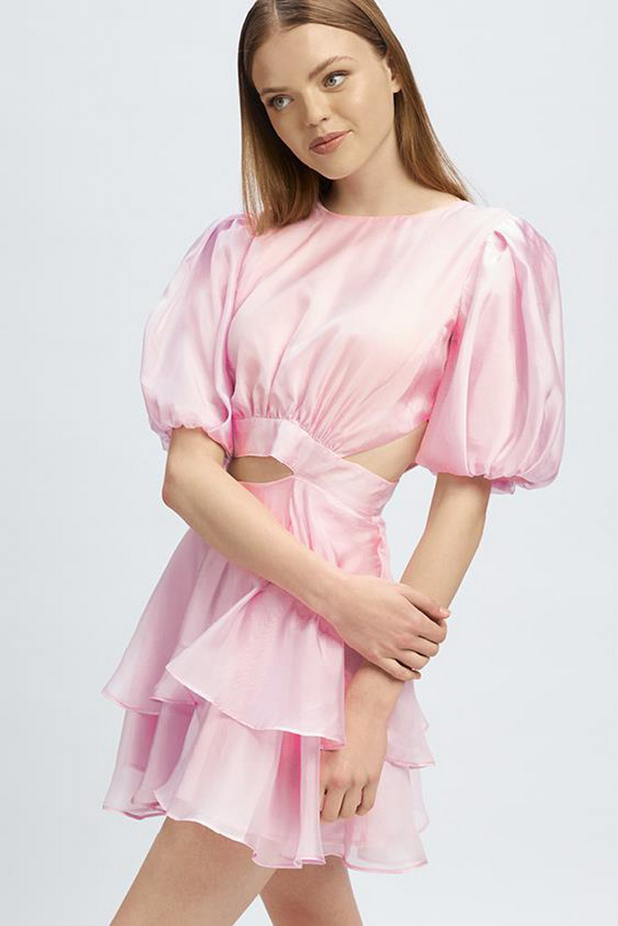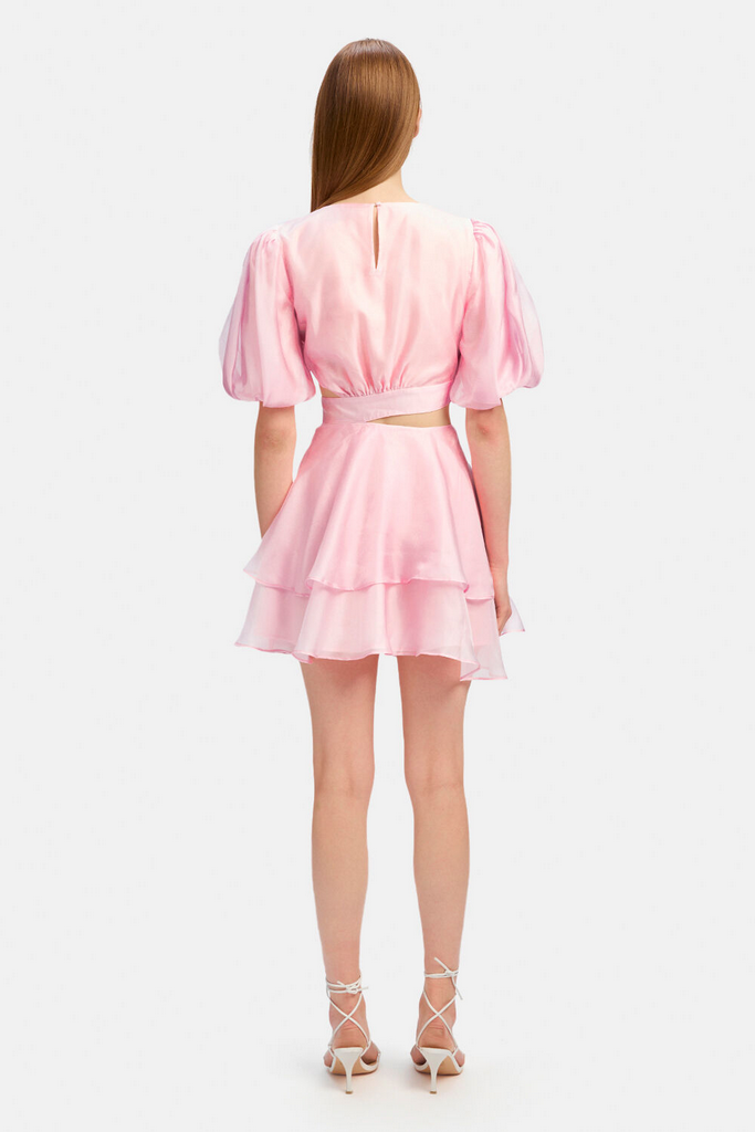This floral-inspired design is rendered in organza to capture the petal-like lightness and sweetly-soft texture of Spanish flowers. A simple bodice with a cinched-in waist and a striking asymmetrical cutout adds sensual allure. This is balanced with voluminous sleeves and a two-tiered skirt, which creates a multi-dimensional effect that flourishes with movement. A day-to-night staple that will take you effortlessly from brunch and daytime parties to nighttime events.