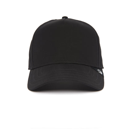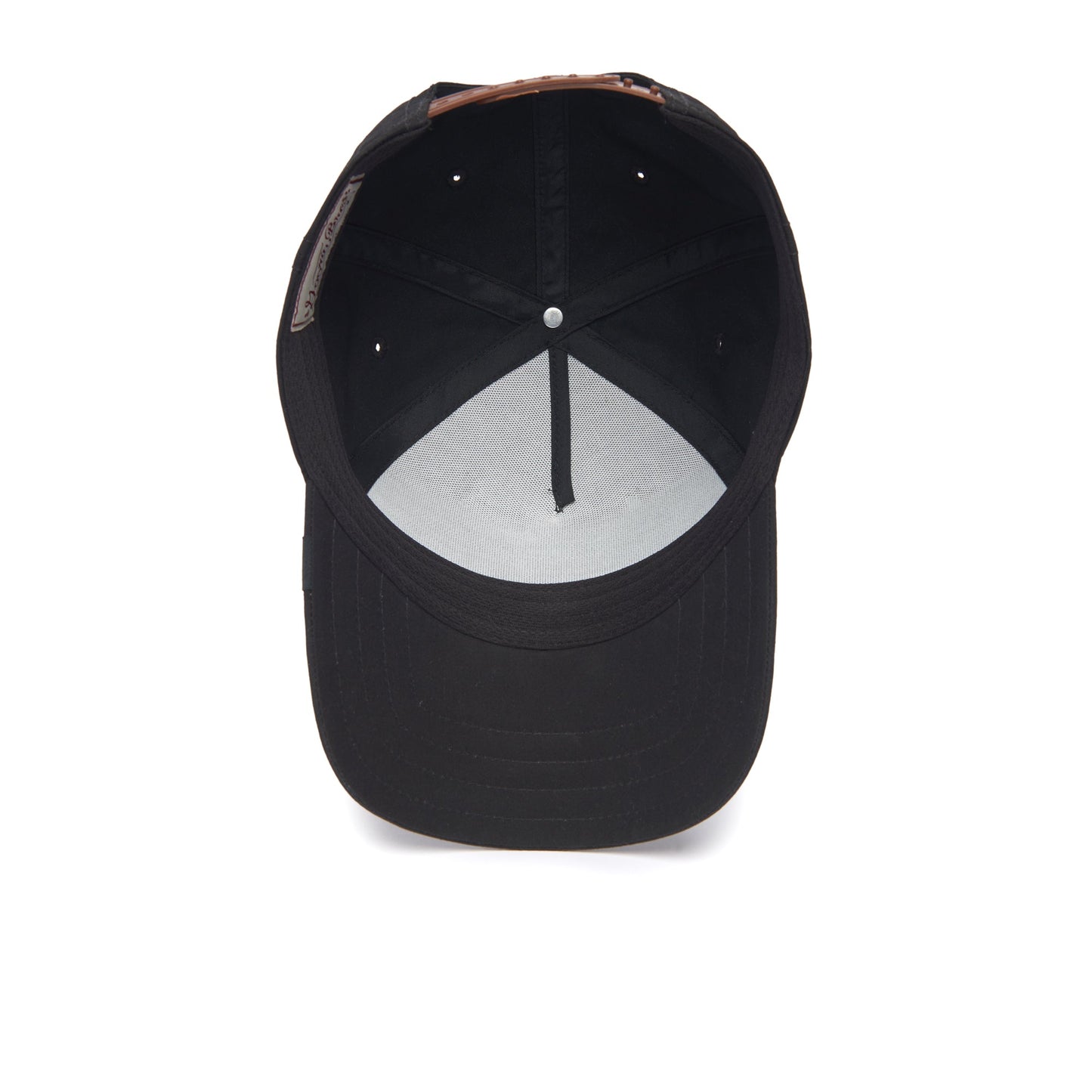 A laconic black baseball cap with a seamless front panel from the American brand GOORIN BROTHERS. The model is made of pure smooth cotton. The size is adjustable with a brown plastic clasp. On the visor there is a branded label with the brand logo. Eyelets are provided for ventilation. The length of the visor is 6.5 cm, the depth is 12 cm.
