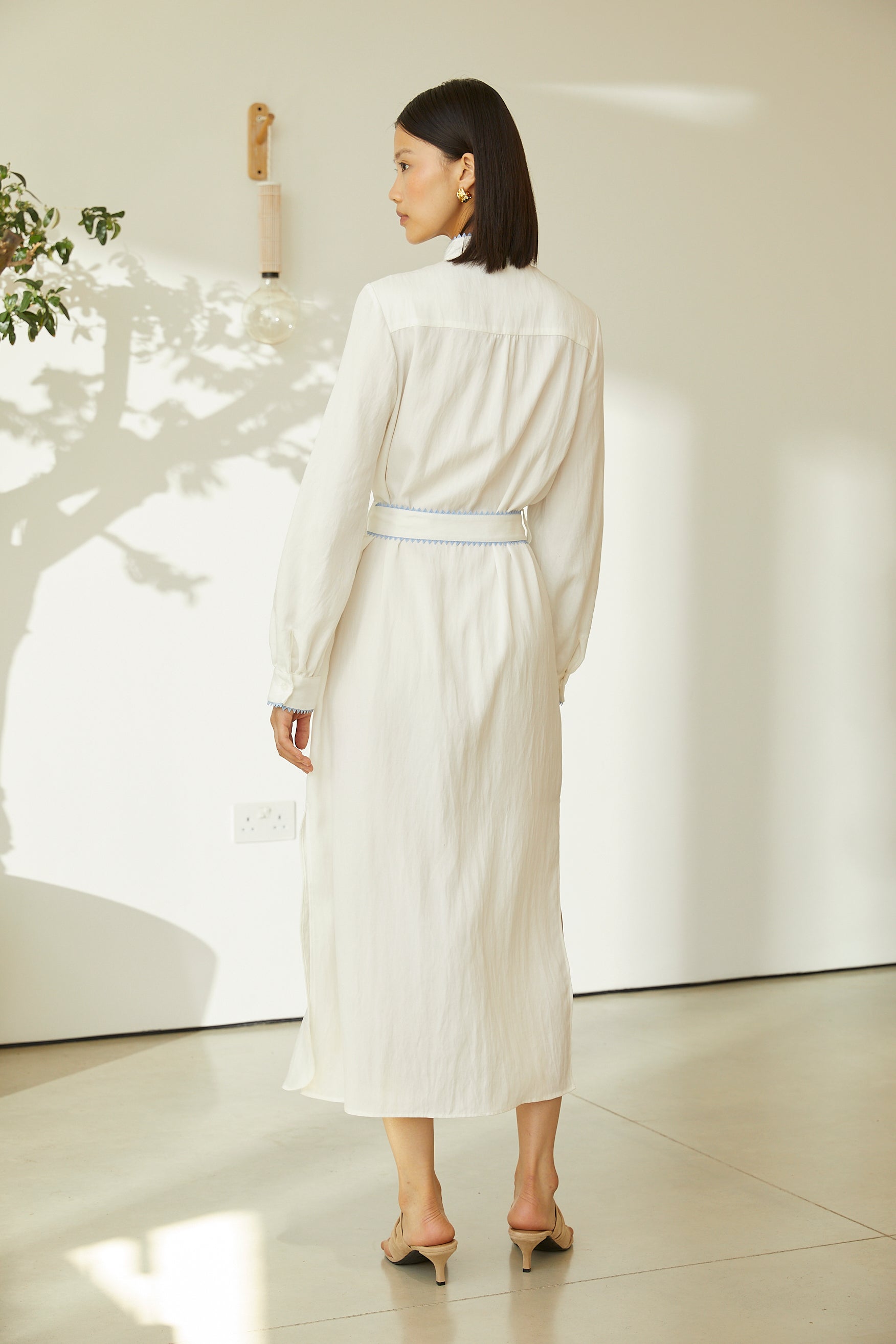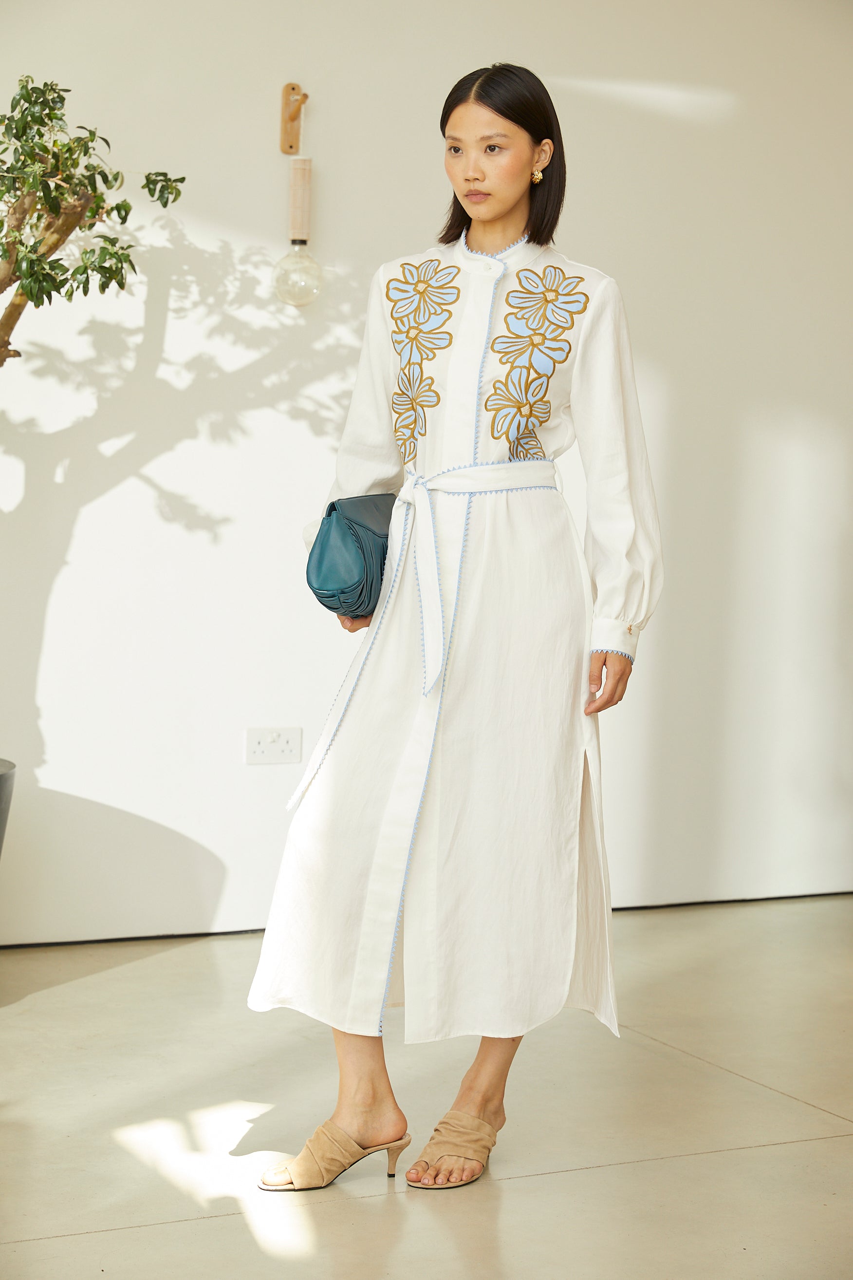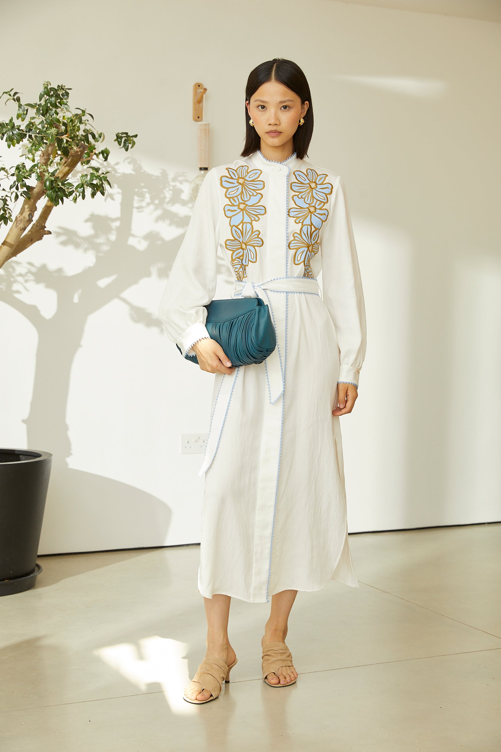 Graceful and artfully detailed, this ivory midi dress is designed to make an effortless statement. Featuring delicate floral embroidery across the bodice, the dress blends timeless craftsmanship with a modern, fluid silhouette. The mandrain collar neckline, concrealed front placket, and long sleeves add a refined touch, while contrast piping subtly defines the structure. A self-tie belt cinches the waist for a flattering, adjustable fit, making this dress perfect for daytime occasions, festive gatherings, or elevated everyday wear. Style it with minimal sandals for a relaxed look or pair it with heels and statement accessories for a polished finish.