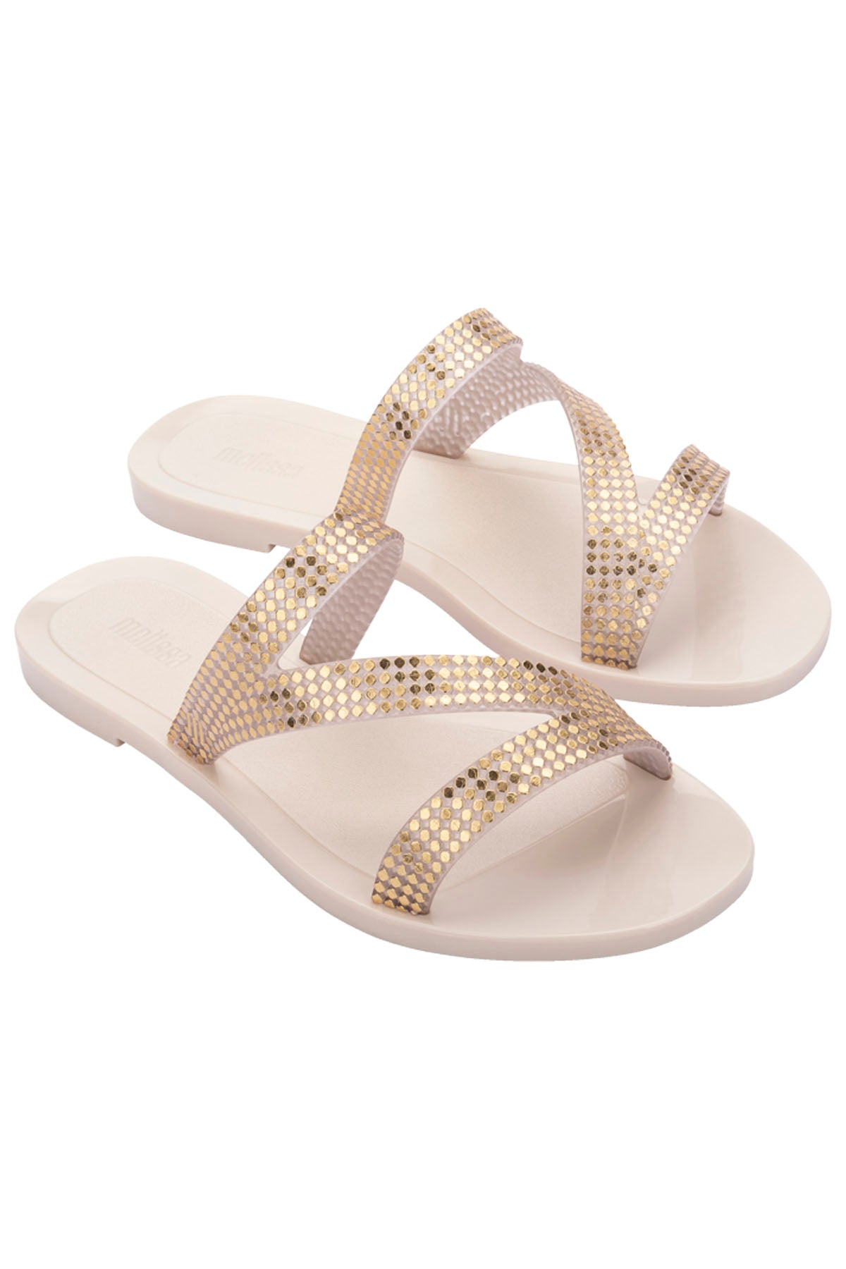Ready to step up your fashion game? The Melissa Siena Slide is your ticket to instant elegance and comfort! Its elevated design takes cues from international fashion trends, which include lots of sparkling in the coming seasons. The upper is made up of three straps with a golden metallic finish that is impossible not to want on your feet at all times! You already shine, but this lightweight slide will make you stand out from a crowd.