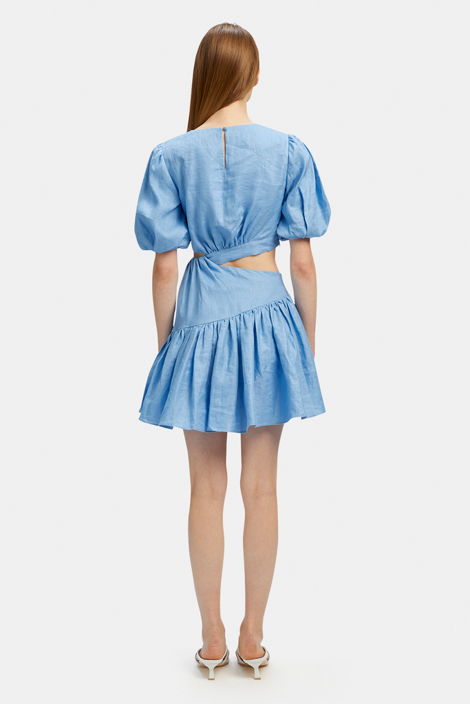 Clever asymmetrical cutting draws the eye to the waist of this mini-dress. Gathering under the bust and in the middle of the back is highlighted by the cut-away sections at the midriff, which add an edge to the pretty shade of blue. Puffed sleeves complete the look.