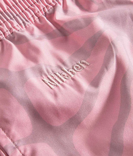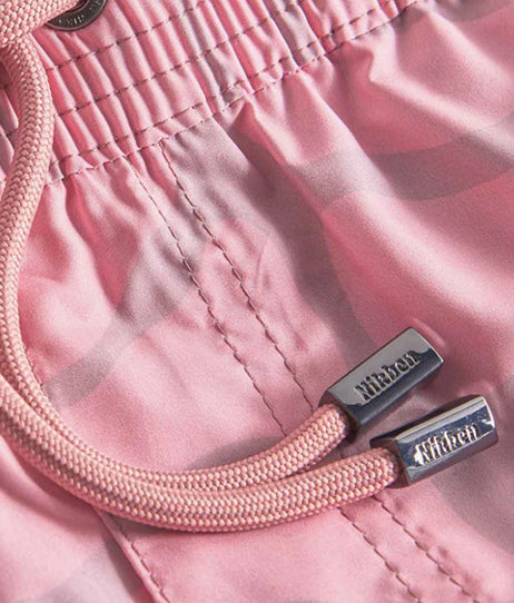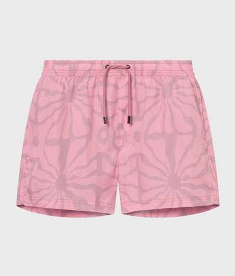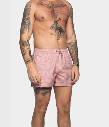 Pale mauve swim trunks are made from recycled plastic bottles (100% recycled polyester) and feature original illustrations on a super fast-drying lightweight fabric. These swim trunks have two side pockets, one zipper back pocket, and fine mesh linings.