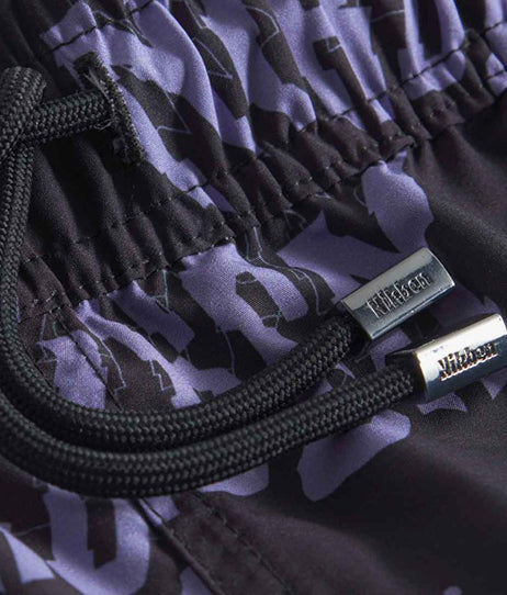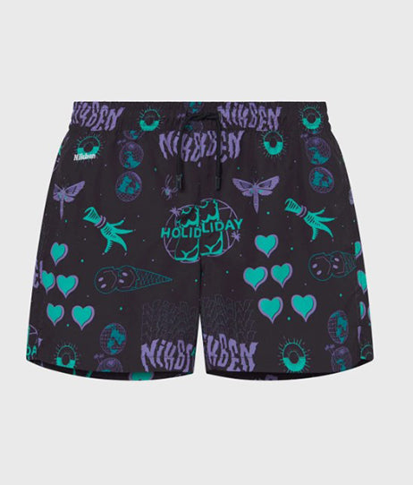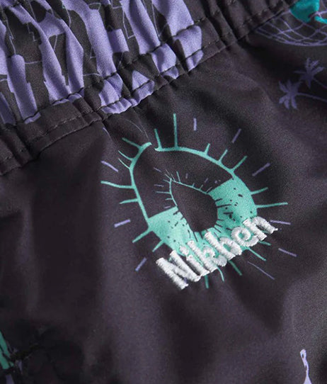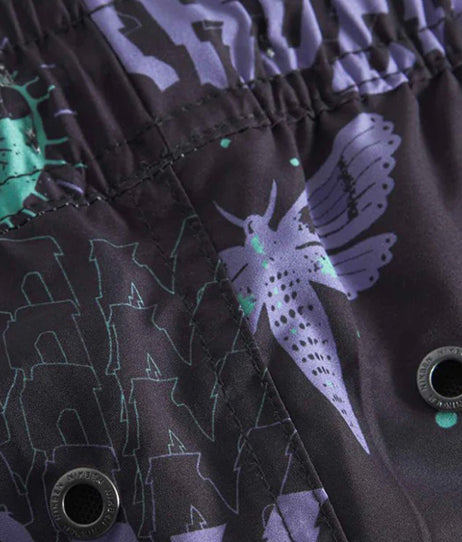 Moontribe swim trunks are made from recycled plastic bottles (100% recycled polyester) and feature original illustrations on a super fast-drying lightweight fabric. These black swim trunks have two side pockets, one zipper back pocket, and fine mesh linings.