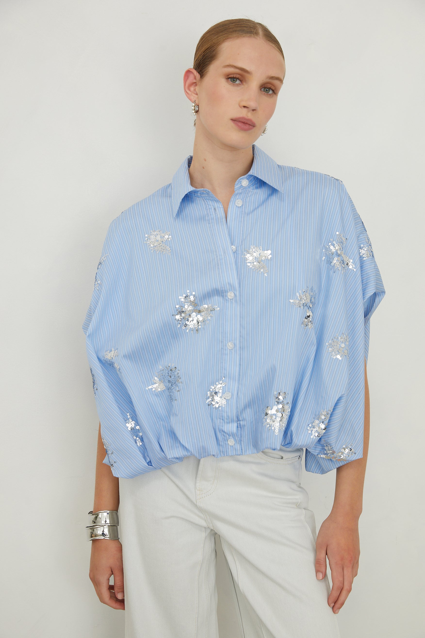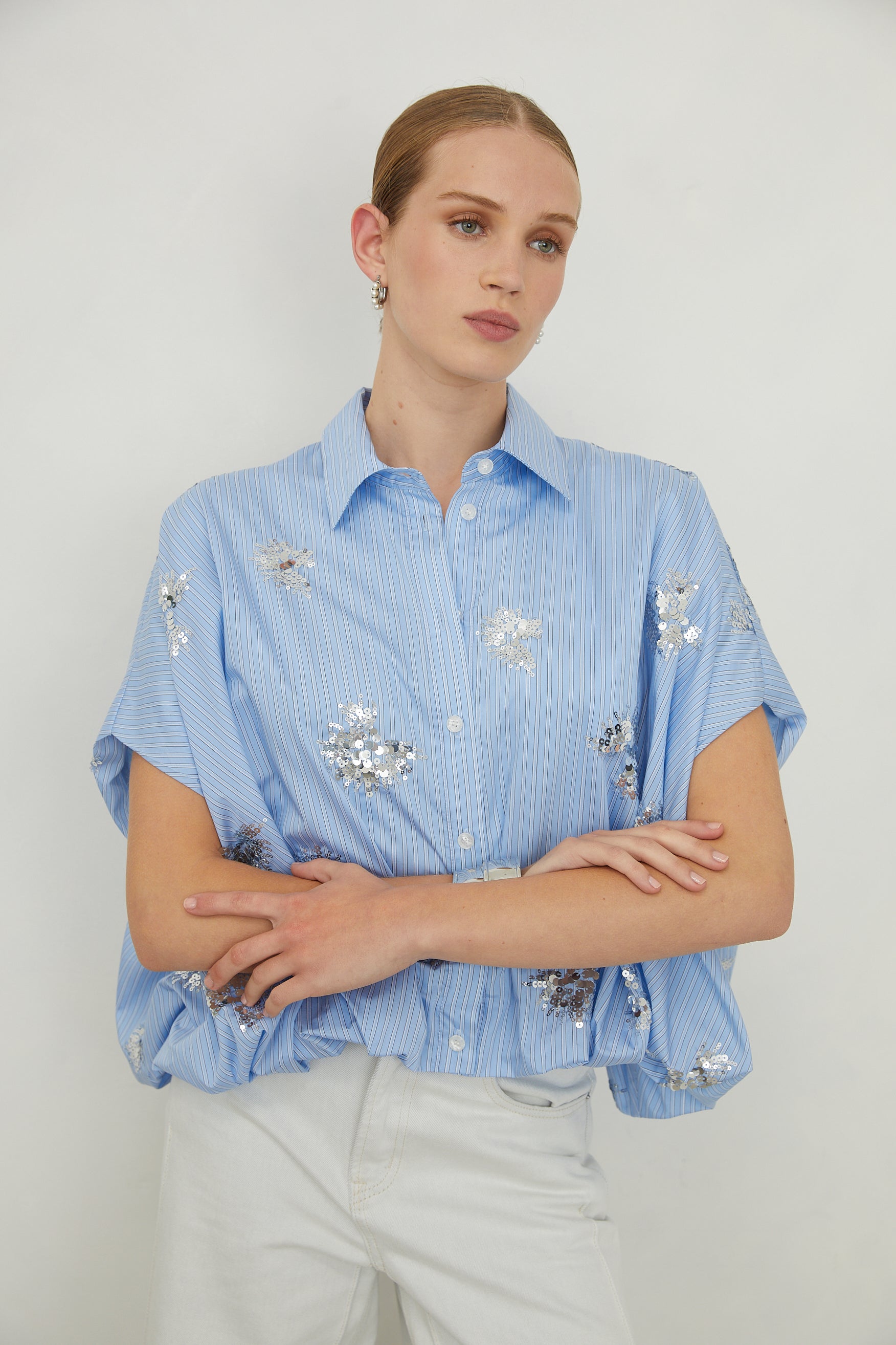 Make a modern statement with this light blue shirt, which blends relaxed tailoring with refined detail. It features delicate all-over embellishments, short sleeves, a cropped elasticated hem, and a collared neckline, elevating the classic striped shirt silhouette. Designed with a loose, contemporary fit, this piece comes with a 100% cotton slip for added comfort and coverage, moving seamlessly from day to evening. Wear it for brunch with ladies with tailored trousers or style it with a mini skirt for an elevated party look.