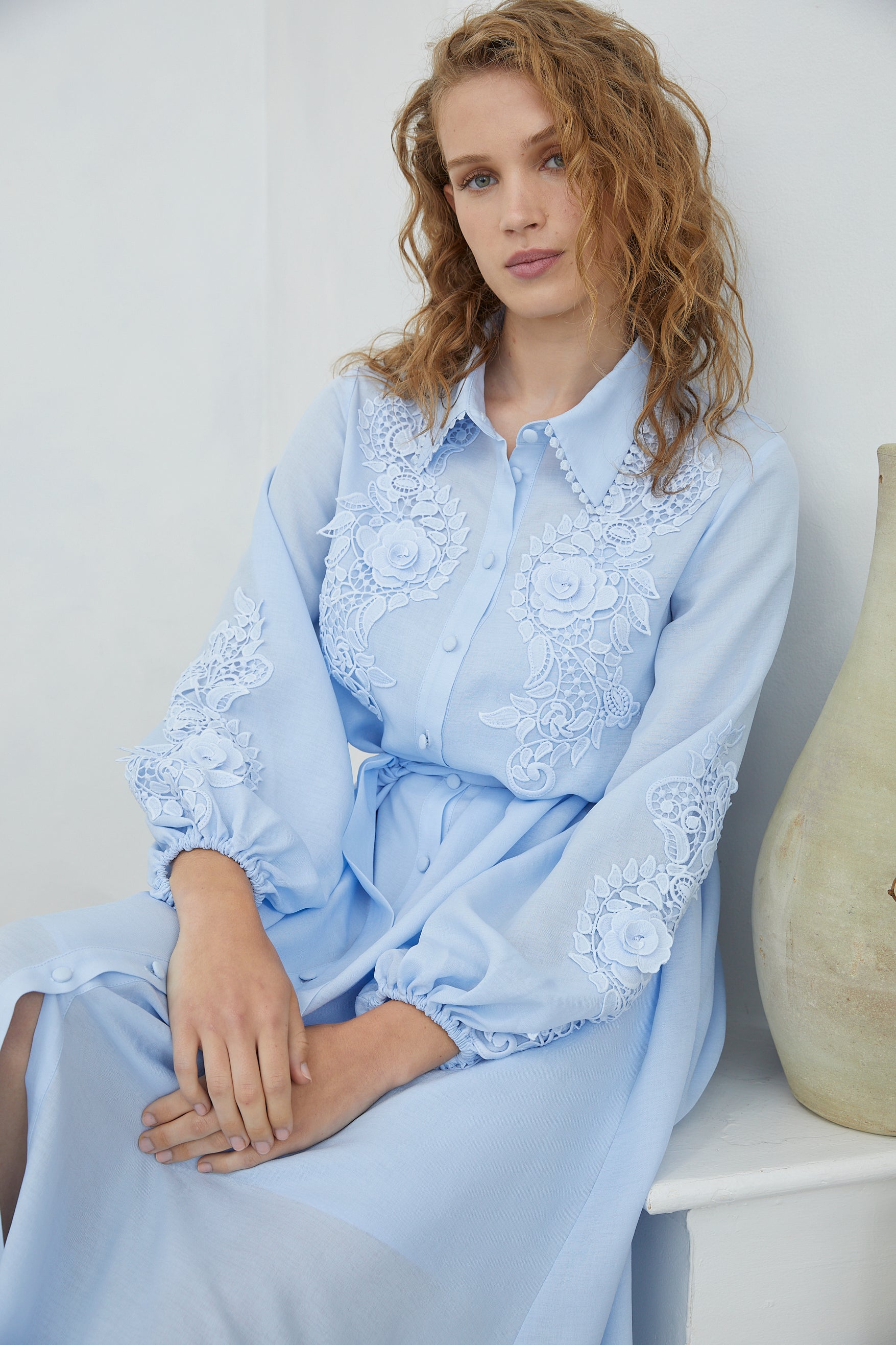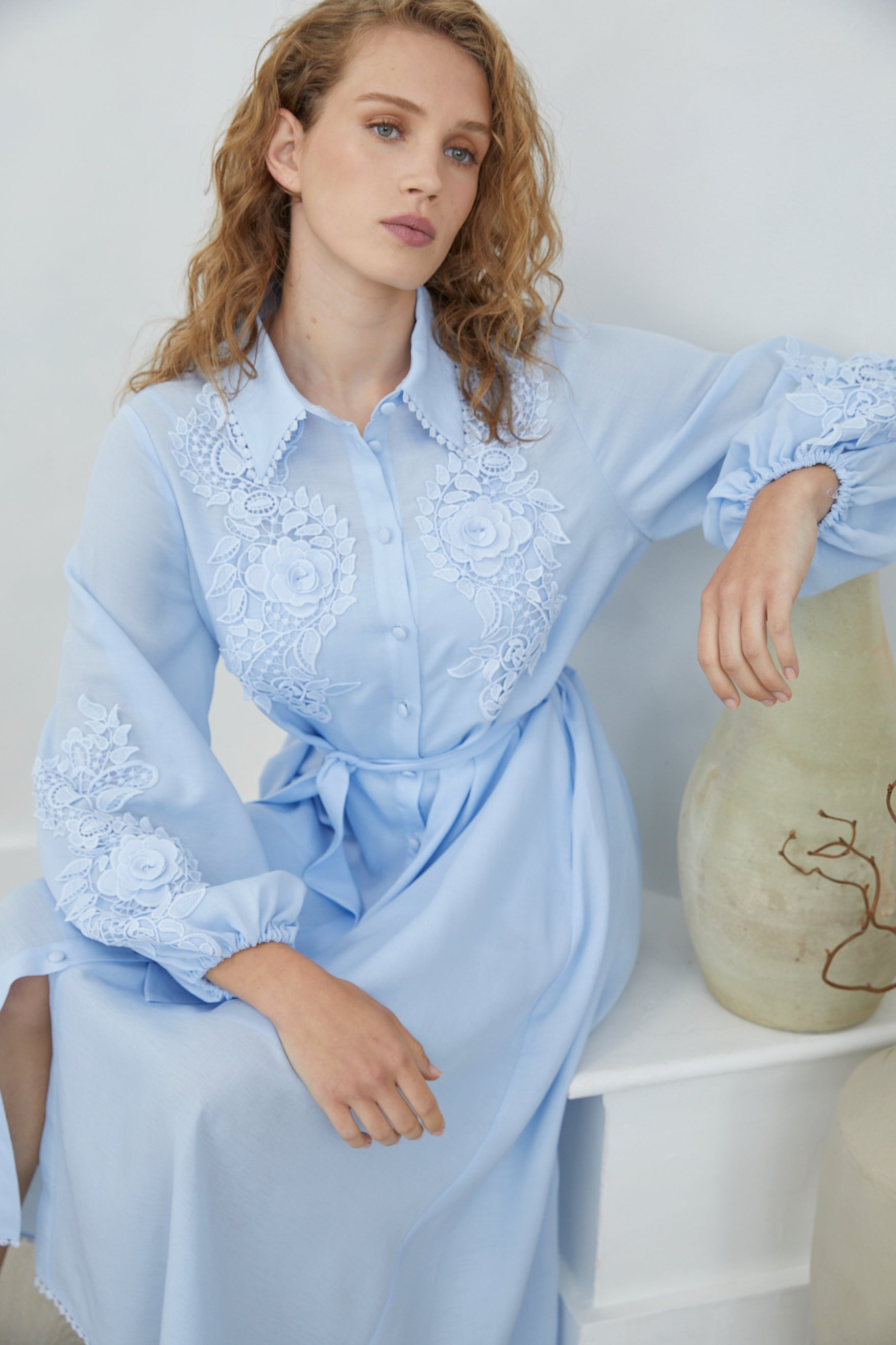 Update your wardrobe with this light blue embroidered shirt dress, crafted from a smooth fabric for an easy, breathable feel and elegant structure. Designed with a button-front closure, waist tie belt, and delicate floral embroidery, this midi shirt dress offers a flattering silhouette that works for workdays, weekends, and special occasions. Finished with long sleeves, a classic collar, and a midi length hem, it’s fully complemented by a lightweight inner slip for smooth, confident coverage. Pair it with sandals for daytime polish or elevate with heels and a structured bag.